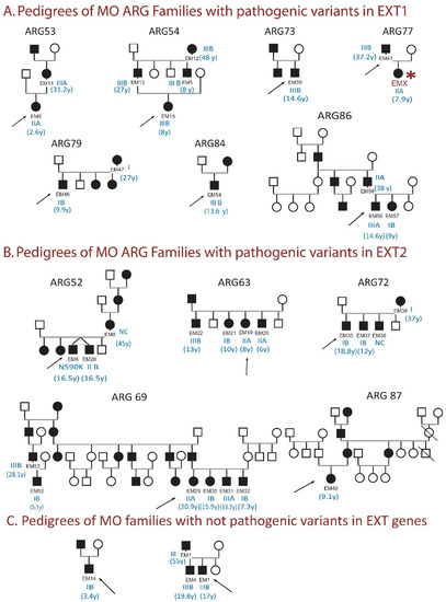 Segregation analysis in the ARG MO families. Indexes are marked with an arrow. Severity score and current age (in brackets) are shown in blue. Patients included in the clinical analysis were named with the prefix EM and a corresponding number. (A) Pedigrees of MO ARG Families with pathogenic variants in EXT1. The red asterisk in ARG77 (EM41) indicates that the patient was also included in the clinical analysis. (B) Pedigrees of MO ARG Families with pathogenic variants in EXT2. (C) Pedigrees of MO families with NO pathogenic variantes in EXT1 or EXT2.