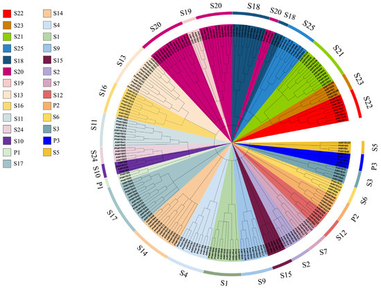 Phylogenetic tree of 113 R2R3-MYB members in petunia and 126 R2R3-MYB members in Arabidopsis. Petunia R2R3-MYB proteins were assigned to 28 distinct subgroups (S1–S25, P1–P3) based on the classification of Arabidopsis. The 28 subgroups were highlighted with different colors.
