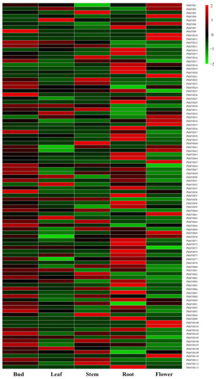 Petunia R2R3-MYB gene expression in different tissues. The R2R3-MYB gene expression levels in the roots, stems, leaves, flowers, and buds is depicted by a heat map. The tissue with the greatest gene expression level was judged to have a gene expression level of two. Blocks with colors represent changes in transcript accumulation relative to the corresponding control, either decreasing (green) or increasing (red).