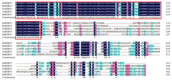 Protein sequence alignment of PhMYB37, NtMYB37, TcMYB37, CsMYB37, and MeMYB37. The accession numbers were listed as follows: NtMYB37, N. tabacum (XP_016438630.1); TcMYB37, T. cacao (XP_017982221.1); CsMYB37, C. sinensis (XP_028089187.1); and MeMYB37, M. esculenta (XP_021611134.1). Red frames mark the MYB DNA-binding domain.