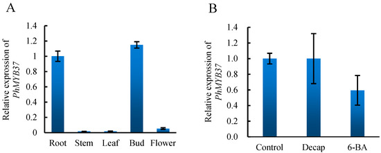 Expression analysis of PhMYB37. (A) The expression analysis of PhMYB37 in different tissues. (B) The expression analysis of PhMYB37 under different treatments. Three pools of 20 plantlets served as the source of all samples. Decap represents decapitation.