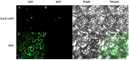 Subcellular localization of PhMYB37 in tobacco leaf epidermal cells. (A,E) Green fluorescence images of PhMYB37-GFP protein and GFP (control). (B,F) Red fluorescence image of marker for nucleus localization. (C,G) Bright-field images of PhMYB37-GFP protein and control. (D,H) The merged images of PhMYB37-GFP protein and control.