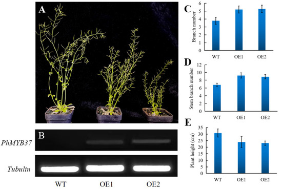 Analysis of the phenotype and gene expression in transgenic PhMYB37-overexpressing Arabidopsis plants. (A) Comparisons between the phenotypes of WT and transgenic plants that overexpress PhMYB37. Different lines that overexpress PhMYB37 are represented by OE 1 and OE 2. (B) RT-PCR evaluated PhMYB37 expression levels. Tubulin detection served as the control. Twenty plantlets from each of three samples were averaged (±SE). (C) Each basal branch’s number is shown (n = 15). (D) Each stem branch’s number is shown (n = 15). (E) The primary stem height for each is displayed (n = 15).