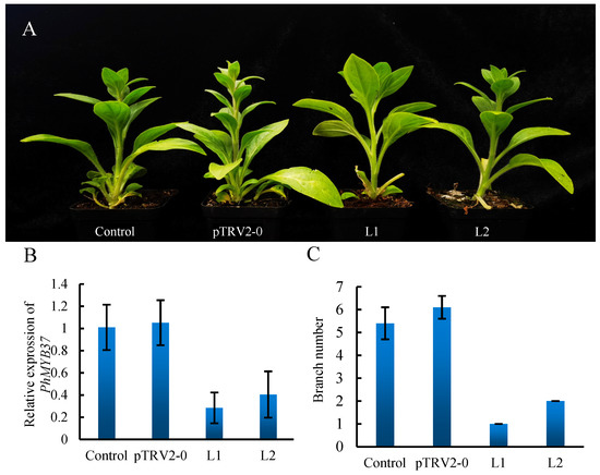 Analysis of the branch number phenotype and PhMYB37 silencing in petunia. (A) Comparison of the phenotypes of control and pTRV2-0 or pTRV2-PhMYB37-infected plants. Different lines that were infected with pTRV2-PhMYB37 are represented by L1 and L2. (B) qRT-PCR was used to detect PhMYB37 transcripts in the total RNA of leaves. The SD of three biological replicates is displayed in error bars. Three pools of 20 plantlets each included four samples: control, pTRV2-0, Line 1 (L1), and L2. (C) The branch numbers of the control, pTRV2-0, L1, and L2 plants are displayed (n = 15).