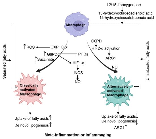 Metabolic reprogramming of macrophages is vital to developing and maintaining their functional phenotypes. Under meta-inflammation and inflammaging conditions, macrophages preferentially polarize towards a pro-inflammatory state (M1-like). M2-like macrophages are more abundant in young, lean individuals. Accordingly, macrophage intracellular metabolism is also reprogrammed to support such activation demands, as shown in Figure 2.