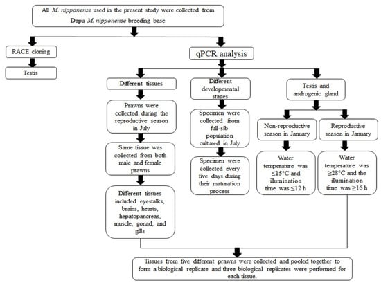 The oriental river prawn (Macrobrachium nipponense) (Crustacea; Decapoda; Palaemonidae) is an economically important freshwater aquaculture species in China [1], with an annual production that reached 225,321 tons in 2019 [2]. In this species, gonad maturity occurs approximately 40 days after hatching in both male and female prawns [3]. This rapid gonad development leads to inbreeding between young prawns, resulting in mating and the propagation of multiple generations in the same ponds, which, in turn, negatively affects the market size of prawns [4,5]. Therefore, an artificial technique to extend the period of testis development in M. nipponense is urgently needed.