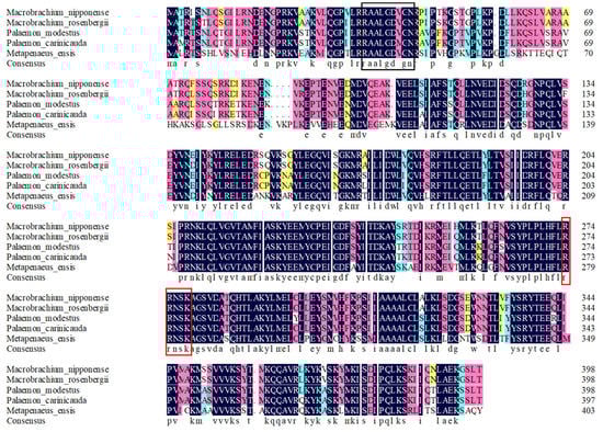 A BLASTX analysis in the NCBI revealed that the similarities between the nucleotide sequence of Mn-CycB and the CycBs in other freshwater prawns were >80%, including Macrobrachium rosenbergii (95.99%), Palaemon modestus (85.71%), and Palaemon carinicauda (84.46%) (Figure 3). The deduced protein sequence of Mn-CycB contained some highly conserved sites or domains, including the cyclin destruction box (RxALGxIxN), which is highly conserved among the known B-type cyclins. It is located at amino acids (aa) 35–43 and regulates cyclin destruction via the ubiquitin proteasome pathway in the N-terminal region. A conserved pkA site (RRxSK) located at 266–270 aa was also found, which is characteristic of B-type cyclins (Figure 3).