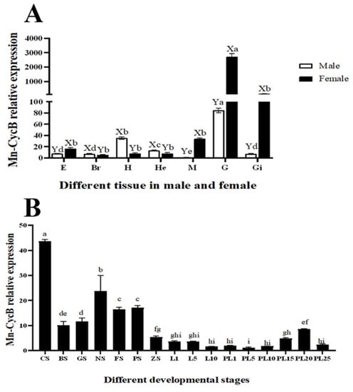 Mn-CycB expression in different mature tissues and developmental stages as determined with qPCR. Lowercase letters on the bars indicate expression differences between different tissue samples (analysis of variance (AVONA)). Capital letters on the bars indicate expression differences in the same tissue between male and female prawns (independent sample t-tests). (A) Mn-CycB expression in different mature tissues. (B) Mn-CycB expression in different developmental stages. E: eyestalk; Br: brain; H: heart; He: hepatopancreas; M: muscle; G: gonad; Gi: gill; CS: cleavage stage; BS: blastula stage, GS: gastrula stage; NS: nauplius stage; FS: posterior nauplius stage; PS: protozoa stage; ZS: zoea stage; L: larval developmental stage; PL: post-larval developmental stage.