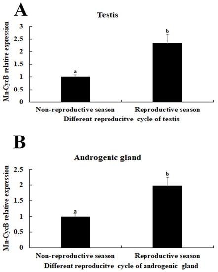 Mn-CycB expression in the testis and androgenic gland of prawns collected during the reproductive and non-reproductive seasons. Lowercase letters (a, b) on the bars indicate expression differences between different tissue samples (independent sample t-tests). (A) Mn-CycB expression in the testis. (B) Mn-CycB expression in the androgenic gland.