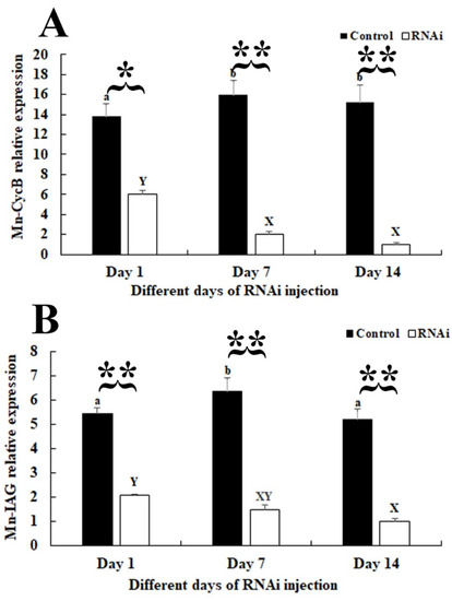 Measurement of Mn-CycB and Mn-IAG expression in the androgenic gland on different days after dsCycB and dsGFP injections. Lowercase letters (a, b) on the bars indicate expression differences between different days after dsGFP injection, and capital letters (X, Y) on the bars indicate expression differences between different days after dsCycB injection (analysis of variance (AVONA)). * p < 0.05 and ** p < 0.01 indicate significant expression differences between the dsGFP- and dsCycB-treated groups on the same day (independent sample t-tests). (A) Mn-CycB expression on different days after dsGFP and dsCycB injections. (B) Measurement of Mn-IAG expression on different days after dsGFP and dsCycB injections.