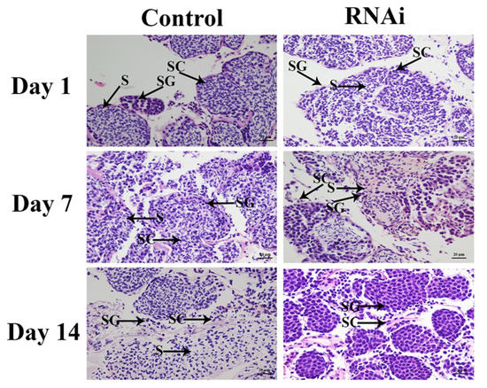 Histological observations revealed that sperm cells were the main cell type (>50%) in the testis of M. nipponense on different days after the dsGFP injection, and they were much more abundant than spermatogonia and spermatocytes. The percentage of sperm did not differ significantly on different days in the control group. However, treatment with dsCycB significantly decreased the number of sperm cells over time, while the percentages of spermatogonia and spermatocytes increased. Sperm were rarely observed on day 14 after the dsCycB treatment, and the majority of cells were spermatogonia (Figure 8).
