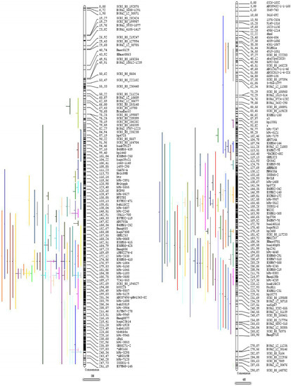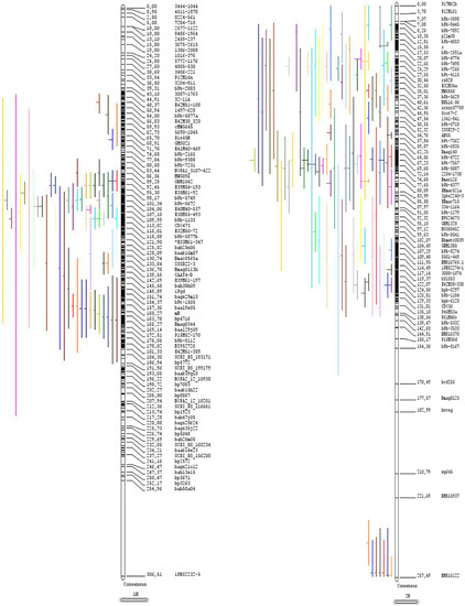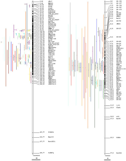 From the 1162 QTL collected, 585 could be projected onto the consensus map generated, given that the markers used to map them were present in the consensus map. For the projection of these QTLs, the confidence interval of 95% was initially calculated for each locus via the equations below: These equations have been modeled for each mapping population [55,56]: F2 and Backcross: