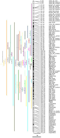 A consensus genetic map containing AFLP, SSR, RFLP, RAPD, SAP, DArT, EST, CAPS, STS, RGA, IFLP, and SNP markers was provided. For this purpose, two genetic linkage maps were used as reference [50,51]. However, the number of markers common between the individual studies used here and any available reference maps was insufficient for a reliable projection of QTL positions. Therefore, BioMercator [52] was used to assemble an integrated map with these published consensus linkage maps [51,53,54] and 26 individual linkage maps (Table S1).