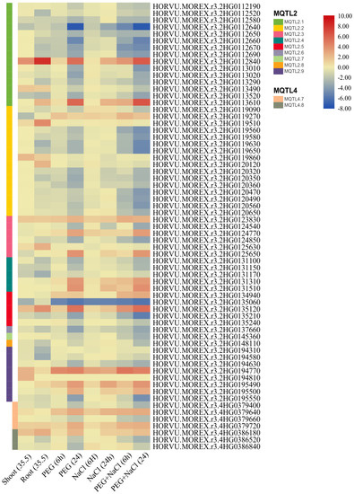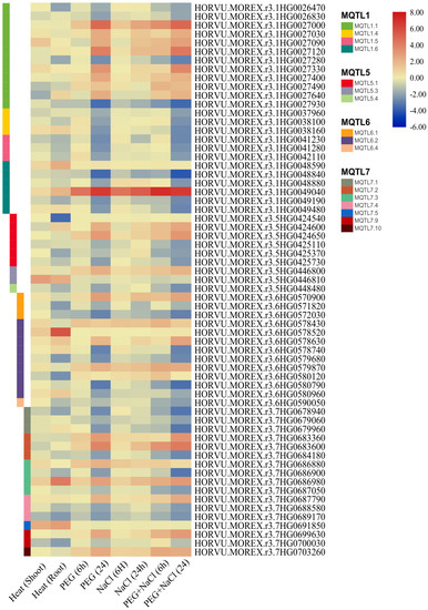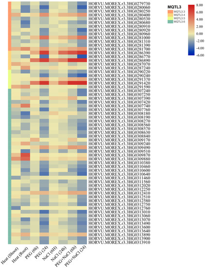 Examination of the geneinvestigator software showed that 191 effective genes for tolerance to salinity abiotic stresses were identified in the MQTLs of this study. Of the 191 candidate genes, 24, 43, 61, 7, 9, 15, and 17 genes were located on chromosomes 1 to 7, respectively. MQTL3.6, MQTL2.2, and MQTL2.1 had the highest number of genes, with 38, 16, and 15 genes, respectively. The expression of genes under abiotic stresses under shoot stress treatment (35.5 h), root stress treatment (35.5 h), PEG stress treatment (6 h), PEG stress treatment (24 h), NaCl stress treatment (6 h), NaCl stress treatment (24 h), PEG + NaCl stress treatment (6 h) and PEG stress treatments were investigated. The highest significant gene expression was observed in MQTL3.6, of which 51 genes had a significant increase in expression and seven genes had a significant decrease in expression. The least significant genes were found in MQTL2.7, MQTL2.8, MQTL5.4, and MQTL6.4. In each of the above MQTLs, only one gene with a significant decrease in expression was observed (Table S5; Figure 4).