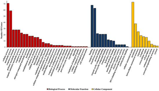 Gene ontology (GO) analysis was performed for 52 identified MQTL regions. Gene ontology (GO) analysis was classified into three categories: biological process, molecular function, and cellular components. The most important biological processes involved included the cellular process, metabolic process, response to stimulus, primary metabolic process, organic substance metabolic process, response to stress, catabolic process, and nitrogen compound metabolic process. The main cellular components involved were the cellular anatomical entity, membrane, intracellular anatomical structure, organelle, cytoplasm, and extracellular region. The most important molecular functions are binding, catalytic activity, transferase activity protein binding, organic cyclic compound binding, and heterocyclic compound binding (Table S6; Figure 5).