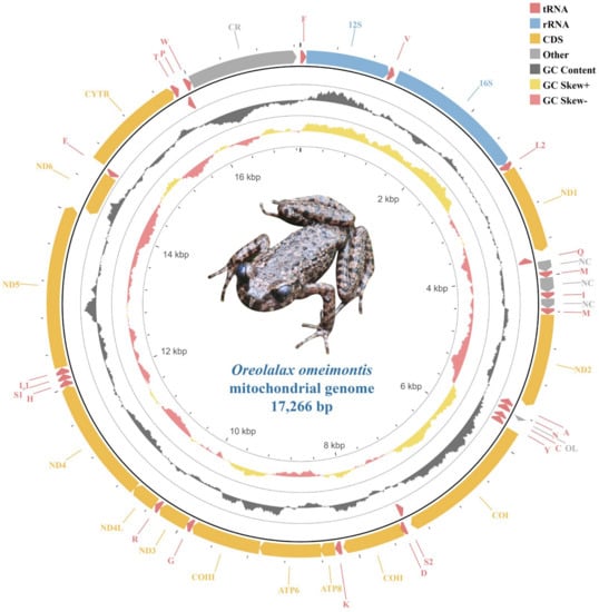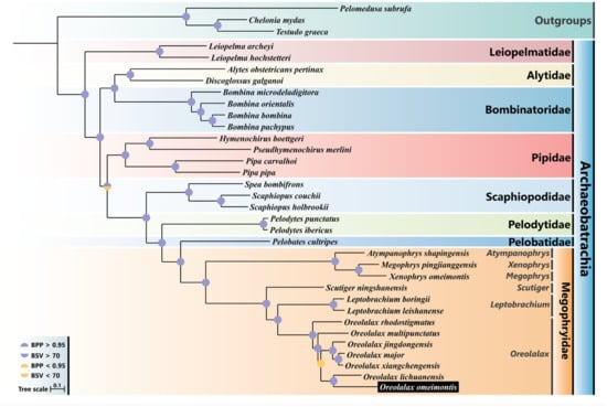 - Li, S.; Gao, X.; Jiang, J.; Wang, B. Complete mitogenome of the toad species Oreolalax multipunctatus (Anura: Megophryidae) and phylogenetic analyses of Megophryidae. Conserv. Genet. Resour. 2018, 11, 195–198. [Google Scholar] [CrossRef]