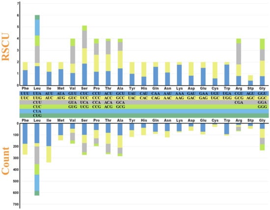 Relative synonymous codon usage (RSCU) in the mitogenome of Oreolalax omeimontis. The different colors in the column chart represent the codon families corresponding to the amino acids below and use consistent colors to represent the same codon families. The stop codon is excluded.
