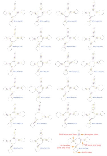 - Peter, S.; Brooks, A.N.; Lowe, T.M. The tRNAscan-SE, snoscan and snoGPS web servers for the detection of tRNAs and snoRNAs. Nucleic Acids Res. 2005, 33, 686–689. [Google Scholar]