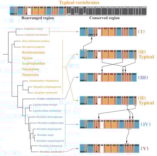 The organization of metazoan mitogenomes is usually conserved [3]. However, many cases of genome reorganization occur in closely related animals [19,51,52,53], so the mitogenome arrangements are thought to reflect phylogenetic relationships [51]. In addition, gene arrangements in mitogenomes are useful to describe the unusual genomic features and settle phylogenetic hypotheses for many Anura species [19,31]. In the Anura, most cases of gene rearrangement have been found in neobatrachians [53,54]. According to previous studies [17,18,19,31], most mitogenomes of archaeobatrachians have a common vertebrate gene order. However, since the publication of Anura mitogenomes, cases of gene rearrangement have been discovered in archaeobatrachians [13,14,15,55,56,57].