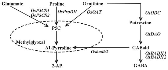 The schematic representation of 2AP biosynthesis pathway in fragrant rice.