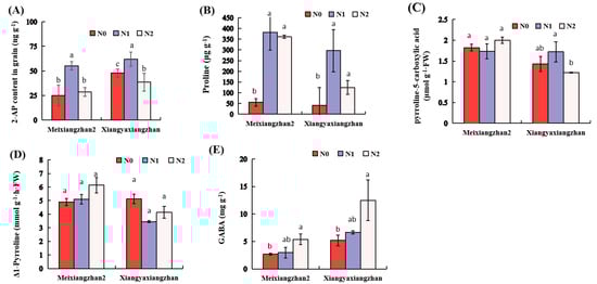 Additional N application at the booting stage affected the grain 2-AP contents in both fragrant rice cultivars. For example, the 2-AP contents were increased by 120.84% in Meixiangzhan2 and 29.48% in Xiangyaxiangzhan under N1 treatment when compared to N0. On the other hand, the 2-AP contents were observed to decrease notably under N2 treatment in Xiangyaxiangzhan; however, N2 was determined to be statistically similar (p > 0.05) to N0 in Meixiangzhan2 (Figure 3A). Moreover, compared with N0, the proline contents were 590.78–623.19% higher in Meixiangzhan2 and 201.8 and 552.16% higher in Xiangyaxiangzhan under N1 and N2, respectively, (Figure 3B), whereas all N levels, i.e., N0, N1 and N2, were found to be statistically similar (p > 0.05) for P5C and Δ1-Pyrroline contents in the grains of both rice cultivars (Figure 3C,D). In addition, the GABA contents were improved, respectively, by 103.85% (Meixiangzhan2) and 140.46% (Xiangyaxiangzhan) under N2 treatments compared to N0 (Figure 3E).