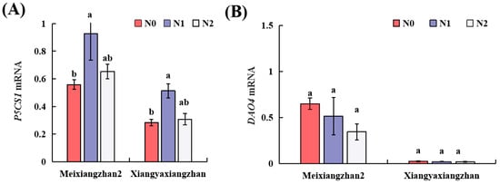 Analysis of transcript levels of (A) P5CS1 and (B) DAO4 in the grains of both fragrant rice cultivars under N treatments. Data are means (±SE), n = 3. The different letter above the column indicates difference at p < 0.05 by LSD tests. Capped bars represent standard errors.