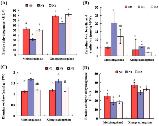 N treatments variably affected the PRODH, P5CS, DAO and BADH2 activities in both tested rice cultivars. For instance, the activities of P5CS and DAO were 60–298.62% and 36.44–47.79% higher under N1 than N0 treatment, respectively, in Meixiangzhan2 and Xiangyaxiangzhan (Figure 5B,C). Treatments with N0, N1 and N2 remained statistically comparable (p > 0.05) regarding PRODH and BADH2 activities in the grains of both rice cultivars (Figure 5A,D).