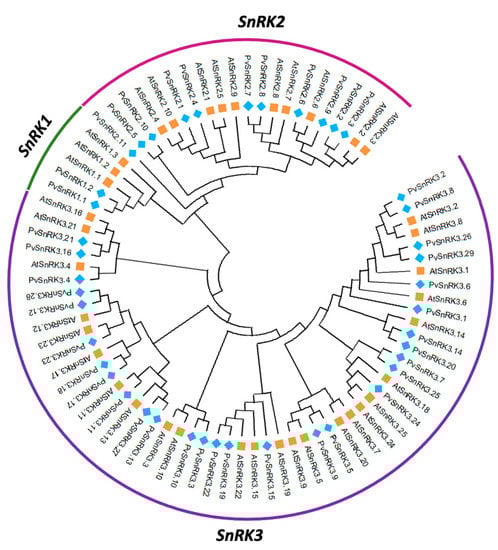 The amino acid and nucleotide sequences of the A. thaliana SnRK gene family were downloaded from NCBI (https://www.ncbi.nlm.nih.gov/, accessed on 14 July 2021). Homologues of AtSnRKs were searched in the Phytozome (https://phytozome.jgi.doe.gov, accessed on 14 July 2021) and Legume Information System (https://legumeinfo.org, accessed on 25 July 2021) databases using BLASTN and BLASTP methods. The respective nucleic acid and peptide sequences were downloaded from the online tool PhytoMine from the plant comparative genomics portal Phytozome v12.1 for further analysis and annotation. The hidden Markov model (HMM) and BLASTP program were applied for preliminary identification of PvSnRK proteins. Local BLASTP (E-value-20) searches were performed based on hidden Markov model (HMM) profiles of PvSnRK gene domains from the Pfam database (http://pfam.janelia.org/, accessed on 18 August 2021). The SMART database (http://smart.embl-heidelberg.de/, accessed on 18 August 2021) was used to confirm PvSnRK gene sequences [42], as were the Pfam database [43] and the NCBI Conserved Domain database [44].