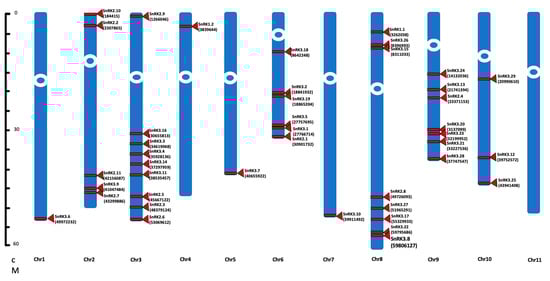 Chromosomal localization of the SnRK genes. The sequences of 42 genes of SnRK genes were identified on P. vulgaris genome. The chromosomes are represented by the numerically distributed blue bars. Red bands and triangles indicate the location of each gene on the chromosome. The numbers in the parenthesis represent the start site of the individual SnRK gene location on the P. vulgaris genome.