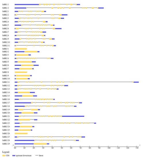 The exon–intron organization of the corresponding SnRK genes. The exons are represented by the yellow boxes, introns by black lines, and the untranslated regions (UTRs) are indicated by the blue boxes. The sizes of the exons and introns can be estimated using the scale detailed at the bottom.