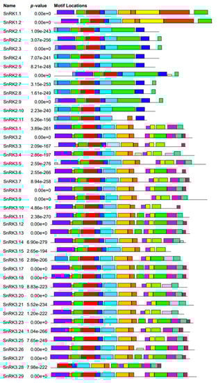 Conserved motifs in the PvSnRK gene family in P. vulgaris were identified using the Multiple Expectation Maximization for Motif Elicitation (MEME) online program (http://meme.sdsc.edu/meme/itro.html, accessed on 2 October 2021) with the following parameters: number of repetitions = any, maximum number of motifs = 20; and optimum motif length = 6 to 100 residues. The gene structure of the PvSnRK gene family was analysed using the Gene Structure Display Server online program (GSDS: http://gsds.cbi.pku.edu.ch, accessed on 10 October 2021) [53].