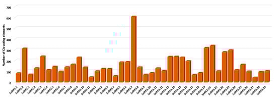 Gene expression is regulated by external factors that are perceived through signalling mechanisms. Such signals activate specific transcription factors that, when combined with cis-acting elements in the promoter regions of genes, alter gene expression. In most genome-wide analysis studies of SnRK gene families, detection of cis-acting elements has focused on abiotic stress conditions in which the presence of hormone-, salt-, temperature-, and drought-specific cis-elements [1,17,30,31,32,33,34,35,36]. As the aim of our investigation was to predict the possible role of the PvSnRK gene family in symbiosis, we analysed symbiosis-related cis-elements as demonstrated in Medicago and L. japonicus. All PvSnRK gene sub-families contain symbiosis-related cis-elements. Among all cis-elements, ERF and MYB are the most abundant, followed by C2H2 and bHLH.