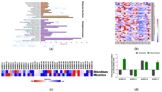 Gene Ontology and in silico expression analysis of SnRK genes. (a) Gene Ontology enrichment analysis of molecular analysis and biological processes for the members of Phaseolus SnRK genes. (b) Tissue-specific expression profiles of Phaseolus SnRKs. Heat map expression profiles of SnRK genes in various Phaseolus tissues. The transcriptome data across different tissues were extracted from the P. vulgaris gene expression atlas (PvGEA). (c) Heat maps showing PvSnRK gene expression patterns specific to AM and rhizobial colonization. Colour bar shows the fold-change range, with red and blue representing upregulation and downregulation, respectively. The heat map was generated by R using the Fragments per kilobase of exon model per million reads mapped (FPKM) values of each SnRK gene. (d) RT-qPCR analysis showing relative expression of Phaseolus SnRK2.10, SnRK3.11, SnRK3.16, and SnRK3.17 genes. Candidate genes were selected and corresponding transcript accumulation under mycorrhized and nodulated conditions was quantified by RT-qPCR. RT-qPCR data are the averages of three biological replicates (n > 9). The statistical significance of differences between mycorrhized and nodulated roots was determined using an unpaired two-tailed Student’s t-test (** p < 0.01). Error bars represent means ± Standard error mean (SEM).