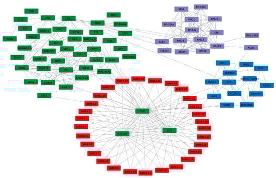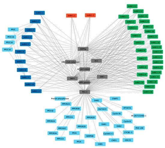 In silico prediction of protein–protein interactions among SnRK1s, SnRK2s and SnRK3s using the Cytoscape tool based on the Pearson correlation coefficients of the relative expression of the gene. Each node represents a protein, and each edge refers an interaction. The red-coloured box represents SnRK1s, blue represents SnRK2s, and green represents SnRK3s.