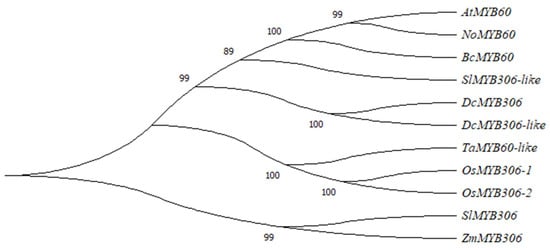 In order to analyze the phylogenetic relationship of MYB60 protein among species, an unrooted neighbor-joining (NJ) phylogenetic tree was constructed with MEGA 7.0 software, including S. lycopersicum, O. sativa, Z. mays, D. carota, Arabidopsis, D. carota, pak choi and N. officinale. In the phylogenetic tree MYB60 proteins of different species are divided into two larger groups SlMYB306 and ZmMYB306. The shared position in a single branch indicates that the two genes are genetically close though they belong to different species (Figure 2). Furthermore, the results of evolutionary analysis show that AtMYB60 of Arabidopsis, NoMYB60 of N. officinale, BcMYB60 of pak choi, SlMYB306-like of S. lycopersicum and DcMYB306 and DcMYB306-like of D. carota are closely related. They are relatively conserved in the evolution process and may originate from the same ancestral gene. In addition, compared with other species, NoMYB60 of N. officinale is more closely related to AtMYB60 of Arabidopsis.