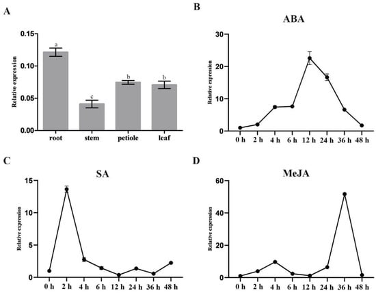 Expression profile of NoMYB60 gene in watercress. (A) NoMYB60 expression levels in different tissues (root, stem, petiole and leaf). The error lines represent the standard errors, different letters represent significant differences, p < 0.05. (B–D) expression analysis of NoMYB60 under respect ABA, SA and MeJA treatments. Watercress, cut to a length of about 15 cm, was exposed to ABA (5 mg/L), SA (5 mg/L) and MeJA (1 mg/L) treatments over a consecutive time course (0, 2, 4, 6, 8, 12, 24, 36 and 48 h). The horizontal axis represents processing times and the vertical axis represents the relative expression.