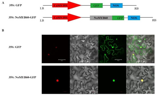 35S:GFP and 35S:NoMYB60-GFP fusion expression vectors were constructed (Figure 4A), and transformed into tobacco. After 48–72 h of Agrobacterium injection, the localization of NoMYB60 protein was observed and photographed with a confocal laser scanning microscope. The results show that 35S:NoMYB60-GFP fusion protein emits green fluorescence in the nucleus, indicating that NoMYB60 is located in the nucleus (Figure 4).