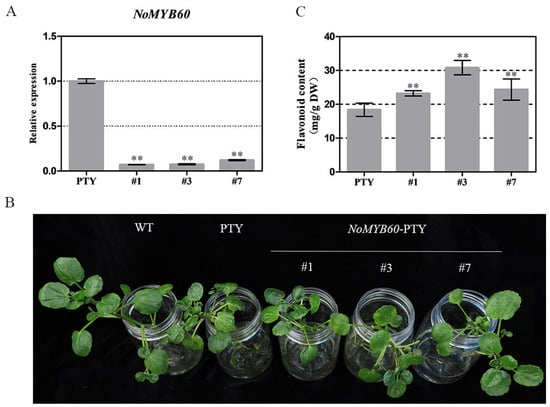 To further verify the effect of NoMYB60 on the flavonoid synthesis of watercress, virus-induced gene silencing (VIGS) was used to obtain loss-of-function plants. The phenotype of mosaic leaves is emblematic of a silencing plant, and this became increasingly apparent in the positive plants of NoMYB60-PTY and PTY after two weeks. The potential loss-of-function plants were collected, and the silencing efficiency of NoMYB60 was evaluated by qRT-PCR. As shown in Figure 5, the transcript abundance of NoMYB60 decreased by more than 80% in NoMYB60-silenced plants #1, #3 and #7 in comparison with the PTY plant. The flavonoid content of NoMYB60-PTY and PTY plants was determined, and the flavonoid content after gene silencing was found to have increased to varying degrees (Figure 5C). This result reveals the function of NoMYB60 in flavonoid synthesis.