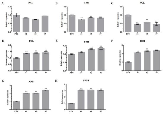 In order to determine whether or not the NoMYB60 gene is involved in the regulation of the flavonoid synthesis pathway in watercress, molecular detection was performed on the expression of key genes in the flavonoid synthesis pathway in NoMYB60 transgenic watercress (Figure 6). Compared with PTY plant, the transcription levels of PAL, C4H and 4CL genes in the earlier stage of the flavonoid synthesis pathway in NoMYB60-PTY plants were down-regulated to varying degrees, and the expression of CHs, F3H, DFR, ANS and UFGT genes in the late stage of the flavonoid synthesis pathway were up-regulated to varying degrees, indicating that NoMYB60 regulates flavonoid synthesis by mediating key genes of the flavonoid synthesis pathway.