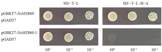 The transcriptional activation activity of NoMYB60 was studied using a yeast two-hybrid (Y2H) system. The full-length cDNA of NoMYB60 was fused to the 3′ end of the GAL4 DNA binding domain of the PGBKT7(BD) vector to obtain the BD-NoMYB60 construct. The BD-NoMYB60 construct was co-transformed with the empty pGADT7 vector (AD) into the yeast strain Y2H gold.