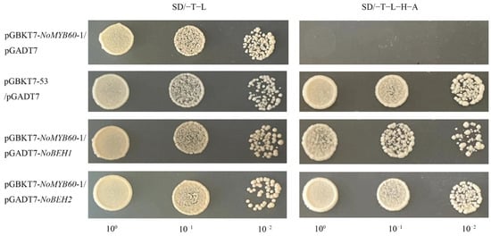In the Y2H assay, we discovered that co-transformation containing the PGADT7-NoBEH1/2 and pGBKT7-NoMYB60-1 plasmids could grow on both SD/−T−L and SD/−T−L−H−A media. This result indicates that NoMYB60 may physically interact with NoBEH1/2 (Figure 8).