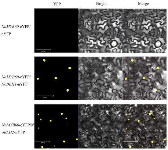 The binding relationship between NoMYB60 and potential interacting proteins was further analyzed by BiFC assay. No yellow fluorescence signal was found in tobacco leaf epidermal cells co-transformed with NoMYB60-cYFP and empty vector nYFP, while significant YFP yellow fluorescence signal was found in tobacco leaf epidermal cells co-transformed with NoBEH1/2-nYFP and NoMYB60-cYFP, indicating that NoMYB60 interacts with NoBEH1/2 in the nucleus of tobacco cells (Figure 9).