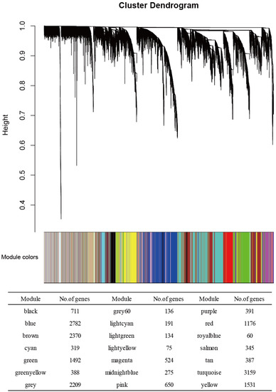 - Zhang, B.; Horvath, S. A general framework for weighted gene co-expression network analysis. Stat. Appl. Genet. Mol. Biol. 2005, 4, 17. [Google Scholar] [CrossRef]