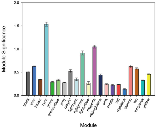 Each module’s MS (module significance) value. Both the cyan and magenta modules were highly enriched with differentially expressed genes (DEGs). Columns: mean values. Bars: standard error of the mean (SEM).
