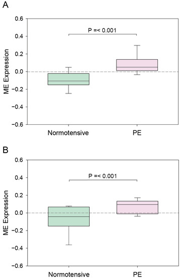 The ME expression profiles for the cyan and magenta modules in the normotensive and PE patients are depicted in Figure 3. In both modules, the eigengene expression was increased in the PE patients. For a further clarification of the relationship between the modules and PE, we determined the mean ME value and used the Student’s t-test to compare the normotensive group to the PE group. As shown in Figure 4, the ME value of both the cyan module and the magenta module was significantly greater in the PE group compared to the normotensive group. Together, these results indicate that the genes in the cyan and magenta modules were mostly upregulated in the PE group.