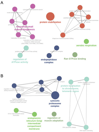 We used the ‘biological process’ and ‘molecular function’ categories for genes in the cyan and magenta modules for the GO analysis by using the Cytoscape plugin ClueGO, which provides a functional annotation map for module member genes in which genes are enriched corresponding to their respective GO terms and pathway. The results of this analysis demonstrated that the cyan module is associated mostly with protein stabilization, ribosomal small subunit biogenesis, the positive regulation of ATPase activity, endopeptidase complex, Ran GTPase binding, and aerobic respiration (Figure 5A), and the magenta module is associated mostly with the cytosolic proteasome complex, protein localization to the chromosomes, the telomeric region, the endoplasmic reticulum-Golgi intermediate compartment membrane, and the regulation of muscle adaptation (Figure 5B). Table 1 provides the complete lists of the significantly enriched GO terms of the cyan and magenta modules and their associated genes.