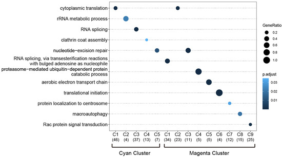 To determine the specific biological relevance of the C1 to C5 clusters among the cyan module’s genes and the C1 to C9 clusters among the magenta module’s genes, we performed a GO analysis on the ‘biological process’ enrichment. As shown in Figure 7, in the cyan-associated C1–C5 clusters, the respective GO biological processes of cytoplasmic translation, rRNA metabolic process, RNA splicing, clathrin coat assembly, and nucleotide-excision repair were identified. In the magenta-associated C1–C9 clusters, the following respective GO biological processes were identified: RNA splicing, transesterification reactions with bulged adenosine as the nucleophile, cytoplasmic translation, nucleotide-excision repair, proteasome-mediated ubiquitin-dependent protein catabolic protein, aerobic electron transport chain, translational initiation, protein localization to the centrosome, macroautophagy, and Rac protein signal transduction (Figure 7). Overall, GO terms for RNA processing and protein processing were prominent in these clusters. Supplementary Table S2 provides the complete lists of the significantly enriched GO biological processes and their associated proteins.