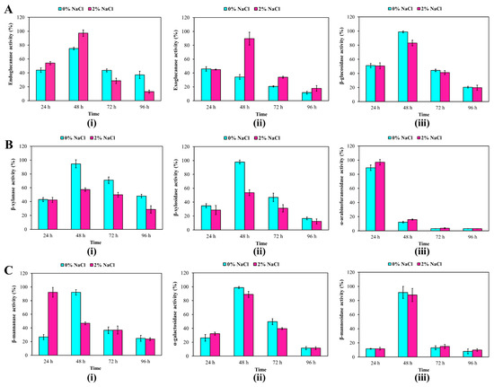 Highest enzyme activity was observed for α-arabinofuranosidase after 24 h of incubation. All tested lignocellulolytic enzymes demonstrated an increase of activity after 48 h of incubation (except for α-arabinofuranosidase). Reduced enzyme activities were seen for all of the tested lignocellulolytic enzymes after 72 h of incubation (Figure 3). Under assay conditions with or without NaCl (2% (w/v)), similar enzyme activities were observed for β-glucosidase, α-arabinofuranosidase, α-galactosidase and β-mannosidase across the 96 h of incubation. The β-xylanase and β-xylosidase revealed higher enzyme activities when NaCl was absent in enzyme assay buffer (at 48 h, 72 h and 96 h of incubation). The genes encoding for β-xylanase (GH5 sub-family 13 and GH10) and β-xylosidase (GH43 and GH43 sub-family 31) contain high proportion of hydrophobic amino acids. This property does not allow the enzymes to counterbalance the hydrophobic interaction strengthened by the presence of salts in the surrounding environment [57], therefore, β-xylanase and β-xylosidase showed lower tolerance to saline condition.