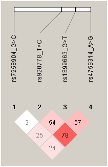 The results of linkage disequilibrium (LD) are shown in the heatmap (Figure 1). In the control, the r2 values between rs920778 and rs1899663, rs920778 and rs4759314, and rs1899663 and rs4759314 were 0.65, 0.93, and 0.77, respectively. In case studies, the r2 values between rs920778 and rs1899663, rs920778 and rs4759314, and rs1899663 and rs4759314 were 0.49, 0.64, and 0.42, respectively.