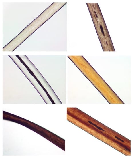The 1 and 5 mm cuttings were analyzed using a Leica FS4000 microscope at 200× magnification. The hairs were mounted on glass microscope slides using deionized water, and photographs were taken using an MU 1000 camera and AmScope software version 3.7. Figure 1 provides representative pictures of hairs from the study. Microscopic characteristics noted were the width, the presence or absence of a medulla, and the pigmentation. The width of the hairs was measured by calibrating the AmScope software with a micrometer. If the width of the hair changed, two measurements were taken, one at the largest diameter and one at the smallest diameter, and the average was taken and used for data analysis. If a medulla was present, it was categorized as either trace, discontinuous, or continuous. Hair treatment information was mostly unknown for the hair samples, except for the hairs received from Microtrace. All microscopy data can be found in Supplemental Table S1, Supplementary Materials.